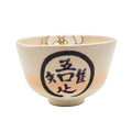 Wheel-thrown chawan with matte ivory glaze. The exterior displays bold black calligraphy enclosed in a circular motif, while the interior features stylized floral elements in white and yellow. Slightly flared rim and rounded base.