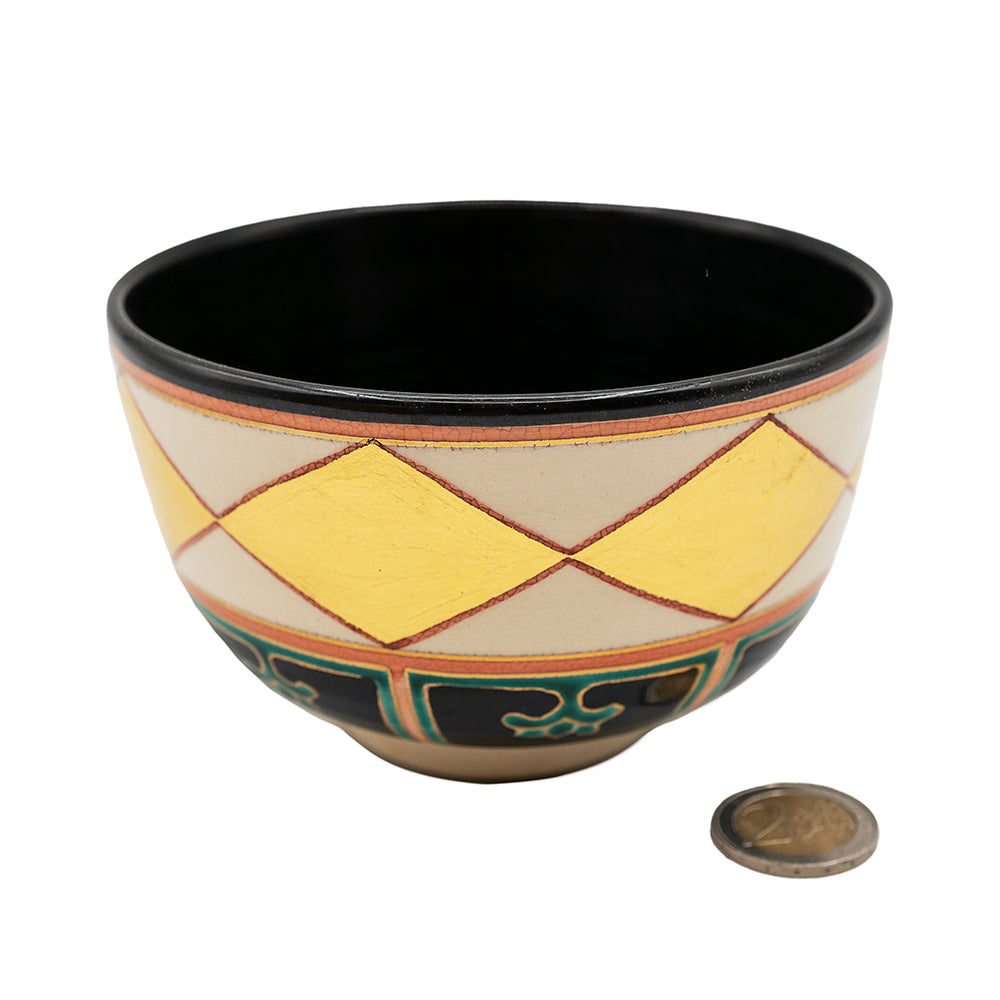 A refined Japanese chawan featuring an elegant diamond-pattern design with real gold leaf inlay. The bold contrast between matte ivory, black glaze interior, and gold elements gives this piece a luxurious, almost Art Deco aesthetic. A collector’s item that bridges traditional craftsmanship with modern decorative sensibility.
