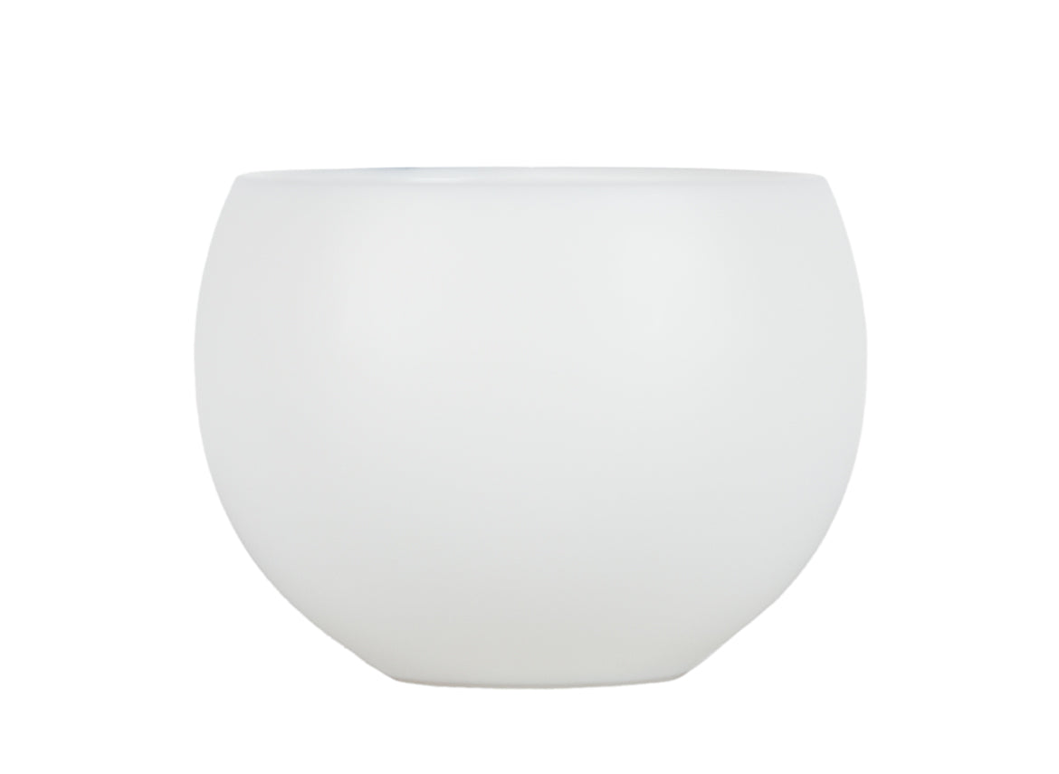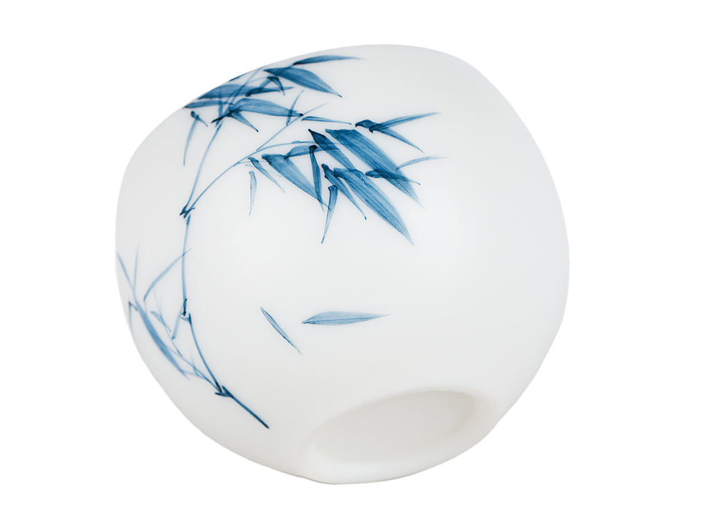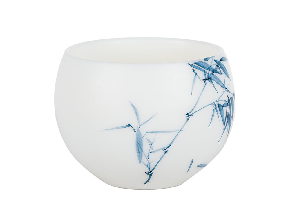 Elegant round cup made of smooth white jade porcelain, decorated with delicate bamboo in blue brushstrokes.