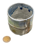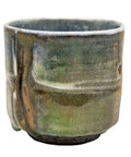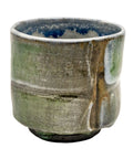 Textured ceramic tea cup with layered ash-green and cobalt glaze, evoking a mossy landscape. Made by Dutch ceramicist Tineke van Gils. Hand-thrown and fired with natural variation.
