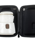 Elegant white ceramic teaware with a modern touch, neatly packed in a sleek black case—perfect for sharing tea anywhere, anytime.