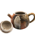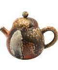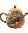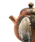 Compact Dehua teapot fired in a traditional wood kiln, featuring a dramatic cascade of natural ash glaze that flows like molten rock across its surface. The unpredictable firing environment gives rise to striking contrasts—earthy browns, silvery greys, and glossy blacks merge into a one-of-a-kind visual texture.