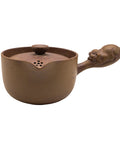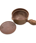 Side-handle Yixing kyusu made from woodfired zisha clay, featuring a subtle ash-kissed surface and minimalist form. The sculpted lion-shaped handle offers both symbolic protection and a firm, ergonomic grip. The built-in clay filter and wide lid provide convenience for solo brewing. Ideal for preparing lightly processed teas like sencha or green dancong. A rare cross-cultural piece merging the Japanese kyusu form with traditional Yixing technique.