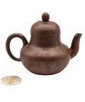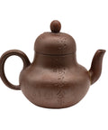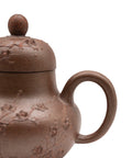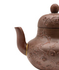 Classic Yixing clay teapot with a natural woodfired finish, adorned with finely sculpted chrysanthemum blossoms wrapping gracefully around the body. The spout is restored using the traditional kintsugi technique with gold-colored lacquer, adding both strength and symbolic beauty to the piece. Elegant proportions and a well-balanced pour make it ideal for sheng puer or roasted oolongs. A poetic tribute to autumn resilience and wabi-sabi imperfection.