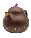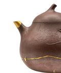 Elegant teapot made of Yixing zisha clay with a subtle woodfired texture. Embellished with an incised tea leaf motif and fine gold-kintsugi repairs + aesthetic stem repair on the spout and surface. Comfortable grip and precise pour. Suitable for oolong, puer, or aged red teas. Beautiful balance of rustic and refined aesthetics.