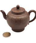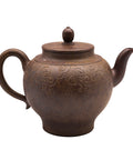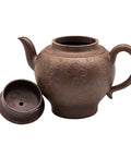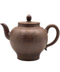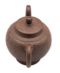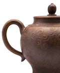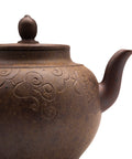 Classic Yixing teapot with carved swirling cloud patterns, fired in a wood kiln for a naturally speckled surface. Made of authentic Yixing zisha clay, with fine detailing and balanced proportions. Suitable for sheng puer or aged oolongs. Holds heat well and ages beautifully with use.