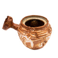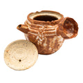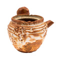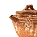 Hand-formed Jingdezhen teapot with textured surface and warm brown-cream glaze. Branch-shaped handle and lid add rustic organic character. Glazed interior.