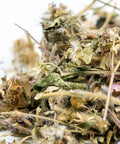A soothing and heart-nourishing blend of hemp plant (Eupatorium cannabinum), astragalus, pine, chamomile, lavender, fireweed, heart nettle, licorice, sage, mint, heather, peony, viburnum leaf, steppe clover, and asters.