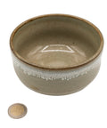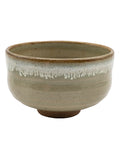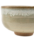 Matcha bowl with earthy green base glaze with layered milky white drip effect. Subtle crackle texture across the surface.
