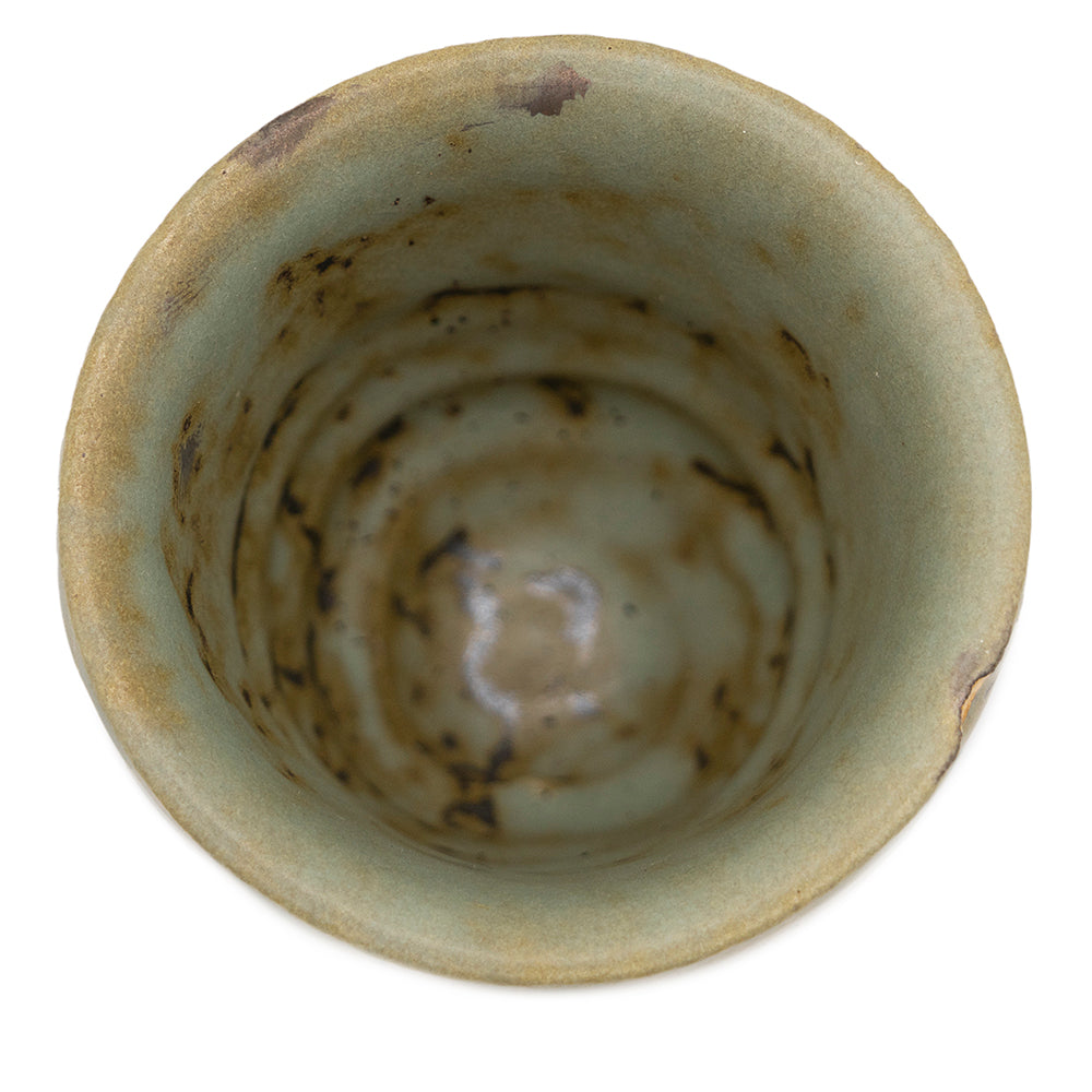 This experimental teacup features a thick, irregularly shaped base and a visually striking contrast between glossy celadon-like glaze and a raw, volcanic-textured lower section. Small golden accents enhance the dramatic landscape of the surface, suggesting melted metal or ancient urban ruins.