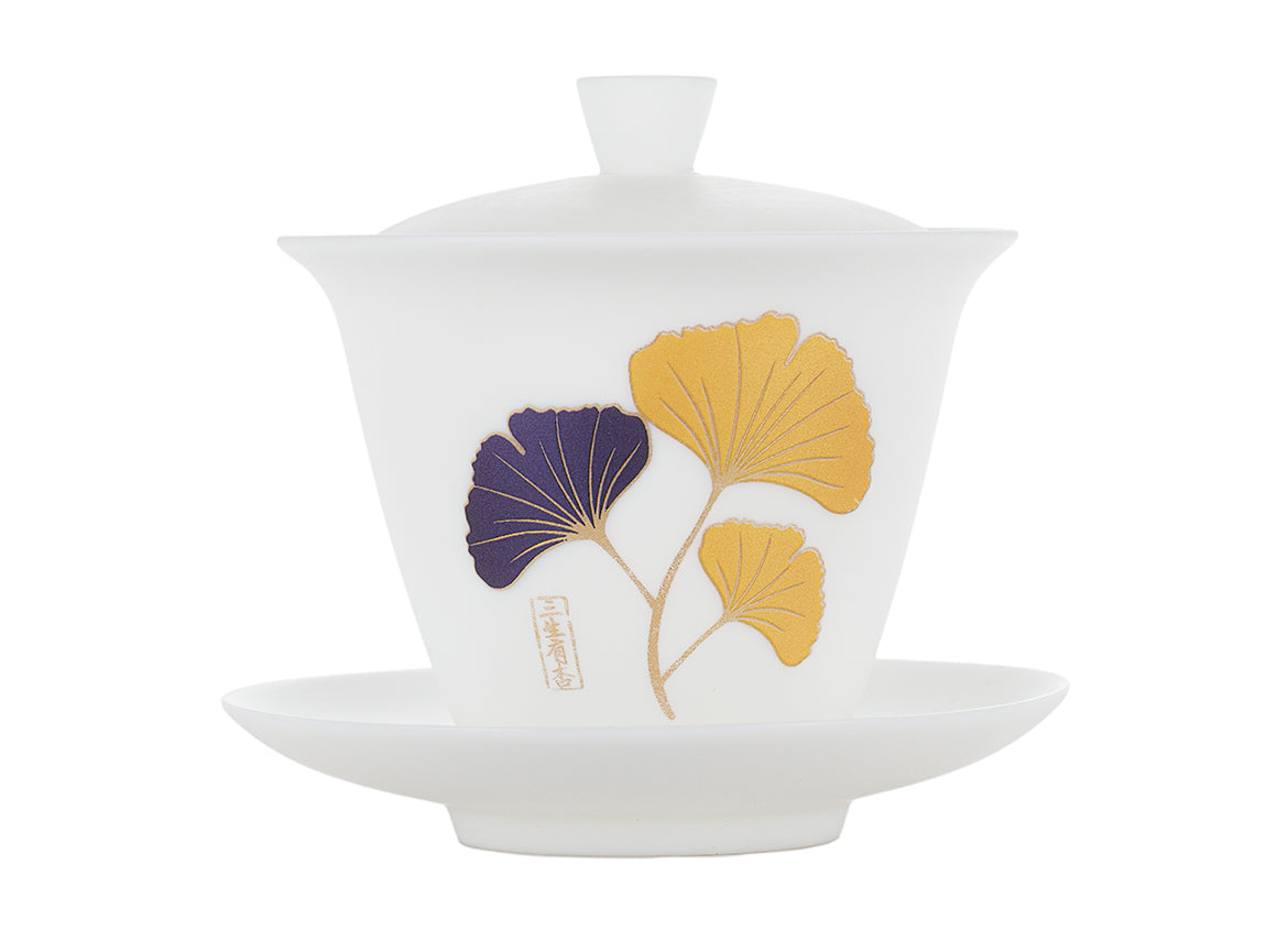 A refined three-piece gaiwan made from white jade porcelain, featuring two painted ginkgo leaves in earthy tones.