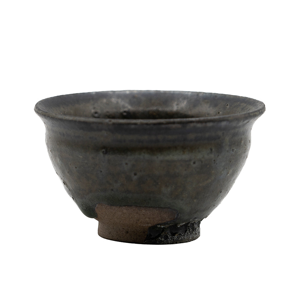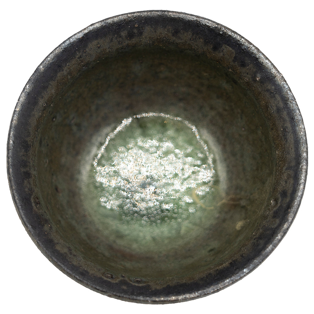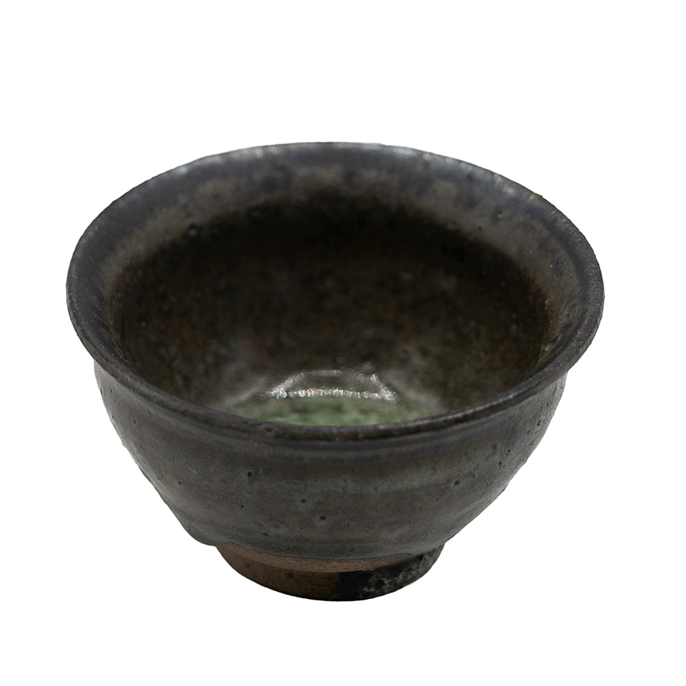 This refined teacup is crafted using traditional ceramic techniques and finished with a tenmoku-style black glaze. The piece was fired in a wood kiln, resulting in a unique surface texture and subtle variations in the dark glaze, which range from matte charcoal to glossy jet-black, with occasional natural ash marks.