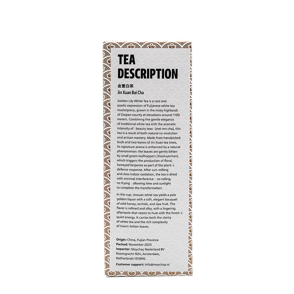 Golden Lily White Tea is a rare and poetic expression of Fujianese white tea masterpiece, grown in the misty highlands of Daqian county at elevations around 1100 meters. Combining the gentle elegance of traditional white tea with the aromatic intensity of “beauty teas” (mei ren cha), this tea is a result of both natural co-evolution and artisan mastery.