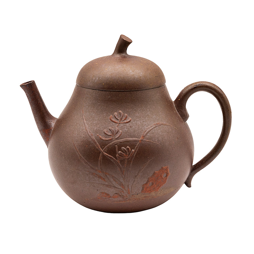 Woodfired Yixing-Style Teapot with Floral Carving # 95012