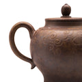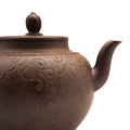 Classic Yixing teapot with carved swirling cloud patterns, fired in a wood kiln for a naturally speckled surface. Made of authentic Yixing zisha clay, with fine detailing and balanced proportions. Suitable for sheng puer or aged oolongs. Holds heat well and ages beautifully with use.