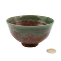 Cuenco de matcha refinado con un llamativo esmalte verde sobre rojo que evoca la apariencia del cobre envejecido (verdín) y la tierra oxidada. Viene en una caja de almacenamiento tomobako de madera. Forma equilibrada y borde ancho para un batido fácil, ideal para la práctica ceremonial o diaria del matcha.