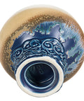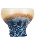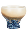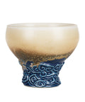 Taza de té elegante con una base de pedestal azul esculpida y un esmalte suave de marfil a azul marino.