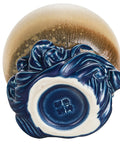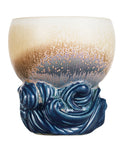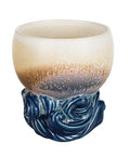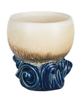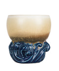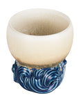 Taza de té de porcelana con una base de pedestal elevada y un esmalte azul fluido. Un degradado suave de marfil a índigo profundo evoca olas y cielo en movimiento.