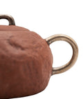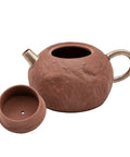 Tetera de arcilla roja con acentos plateados y textura artesanal