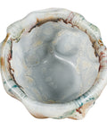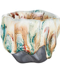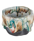 Taza de té en estilo Shino con esmaltes verdes y terrosos fluidos. Contornos orgánicos y un esmalte grueso le dan una sensación táctil y natural.