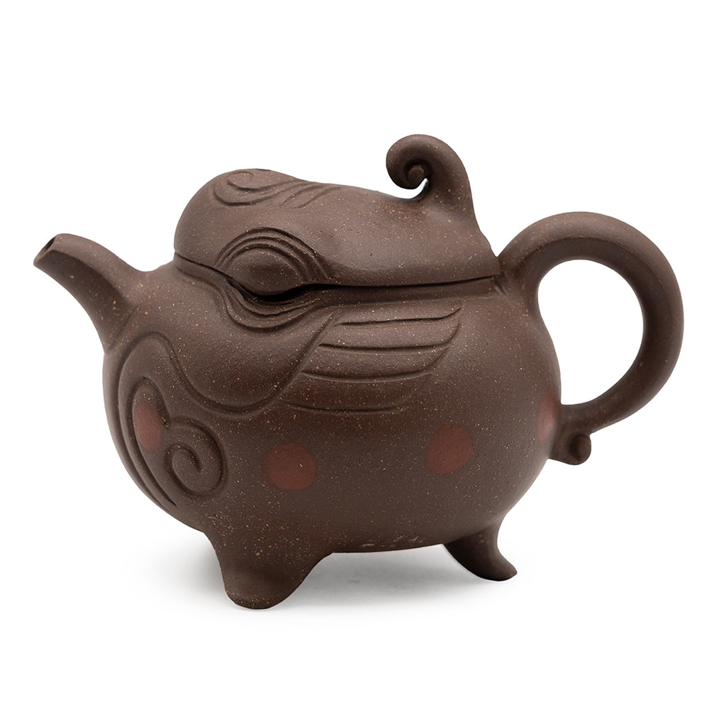 Su forma es una interpretación caprichosa y poderosa de una criatura mítica — posiblemente un dragón estilizado o qilin — con contornos ondulados, un pico enrollado y detalles pronunciados similares a ojos en la tapa y el cuerpo. Una obra maestra escultórica, esta tetera fusiona función con arte expresivo.