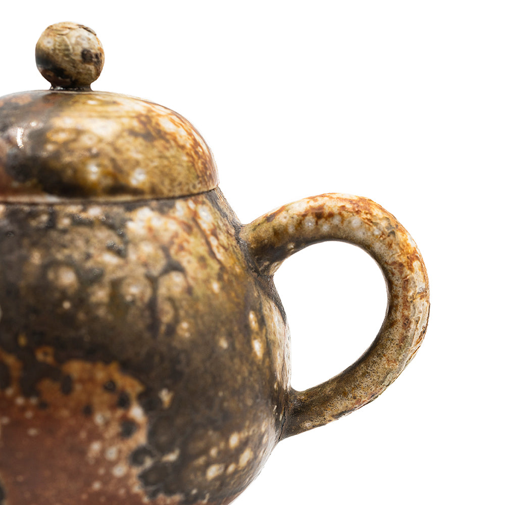 Théière compacte Dehua cuite dans un four traditionnel à bois, présentant une cascade spectaculaire d'émail naturel de cendres qui coule comme de la roche en fusion sur sa surface. L'environnement de cuisson imprévisible donne lieu à des contrastes saisissants—des bruns terreux, des gris argentés et des noirs brillants se fondent en une texture visuelle unique.