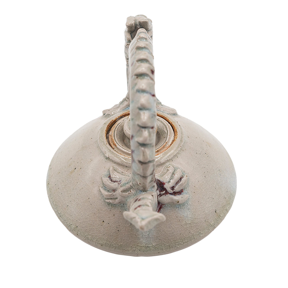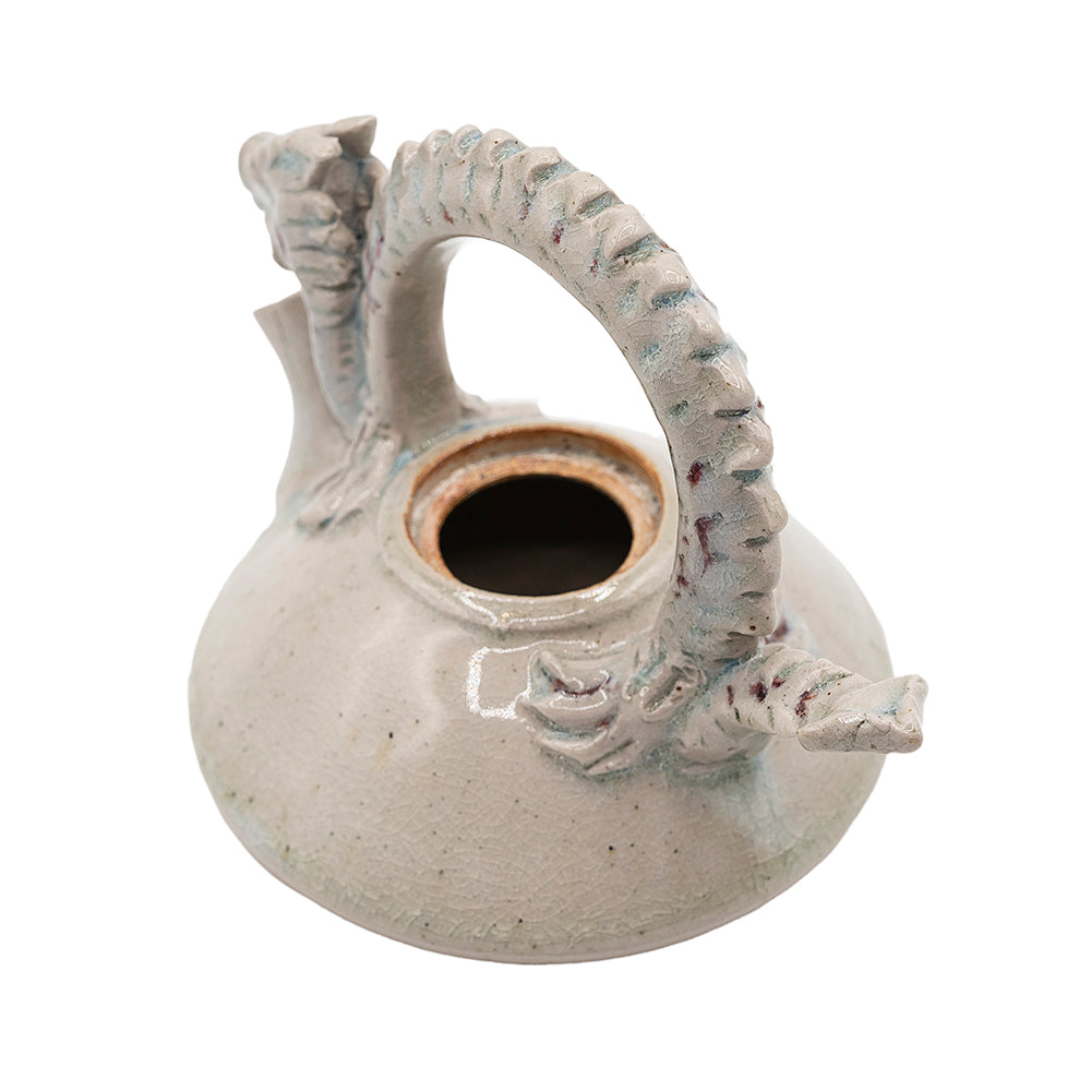 Théière en porcelaine avec poignée et bec en forme de dragon sculpté, conçue par l'artiste céramiste néerlandaise Tineke van Gils. Recouverte d'un glaçage céladon clair et agrémentée de détails rouge-brun, cette pièce allie design symbolique et forme expressive.