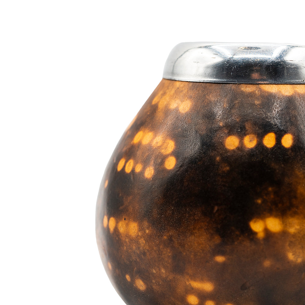 Une calebasse naturelle pour maté avec un bord en métal poli, utilisée pour boire le yerba maté. La surface sombre et tachetée montre la texture naturelle de la calebasse, tandis que le dessus en métal maintient l'ouverture stable et confortable pour boire.