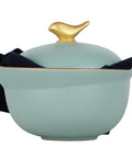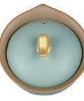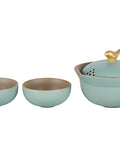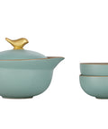 Gaiwan vert élégant et tasses dans un étui de voyage compact. Idéal pour déguster du thé en déplacement ou partager avec un ami.