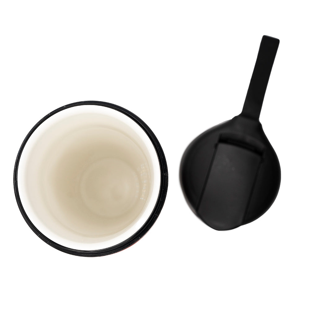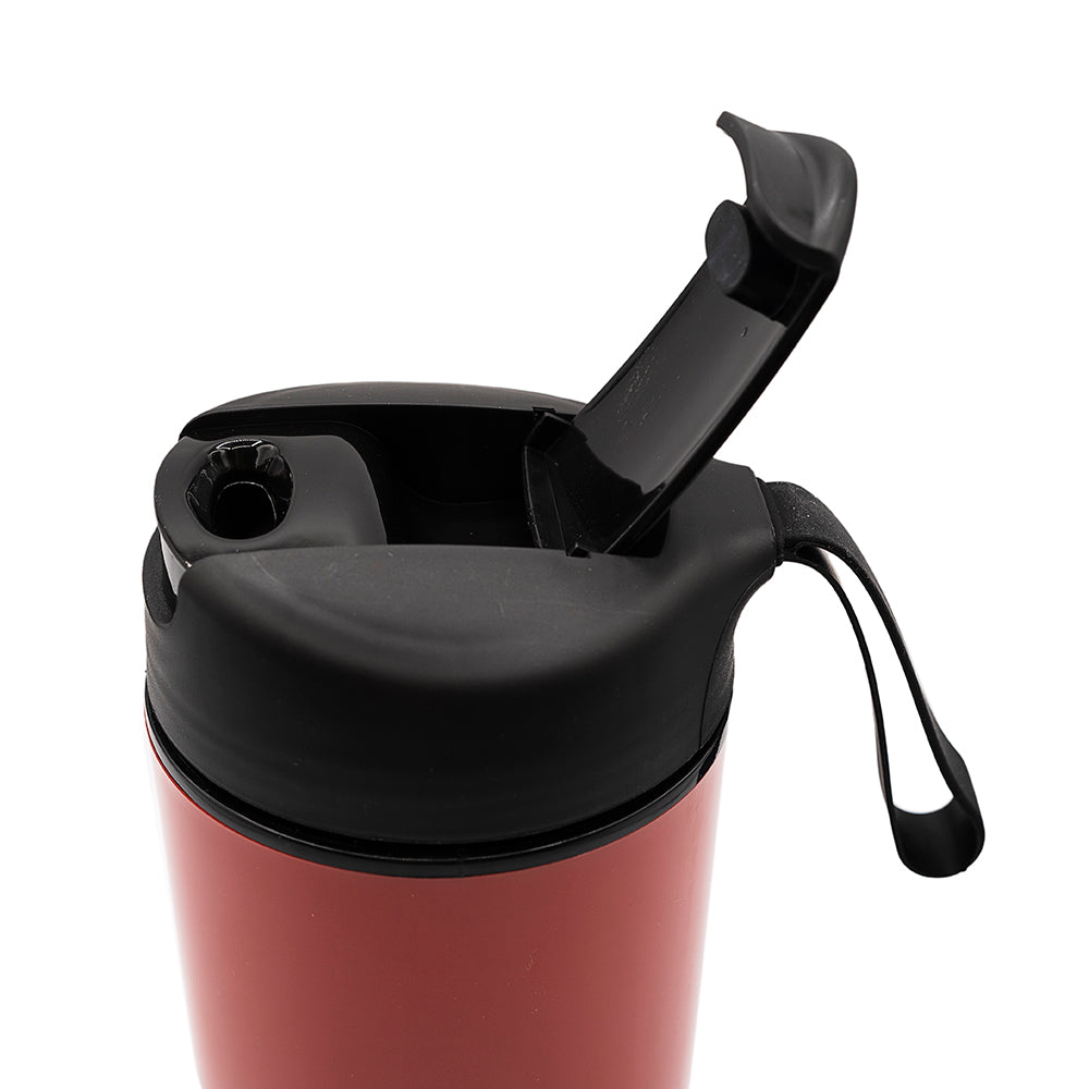 The Deep Red Travel Thermos with Strap is designed to keep beverages hot or cold while on the go.