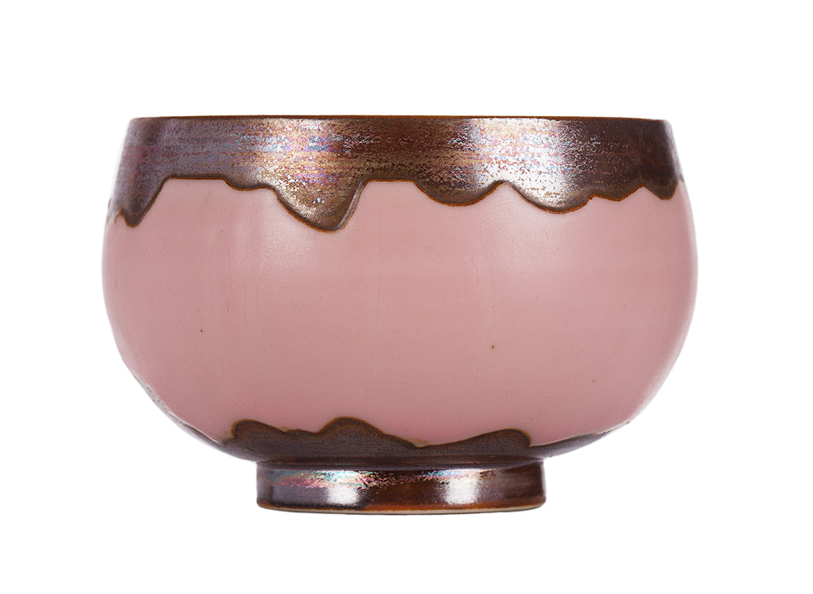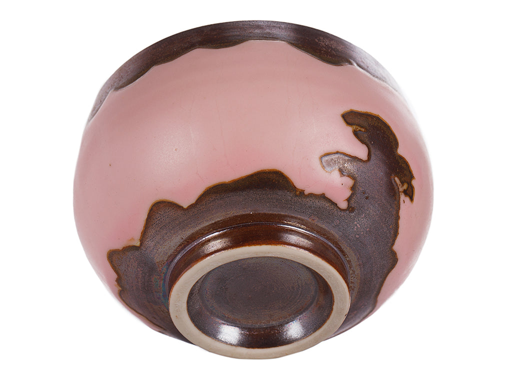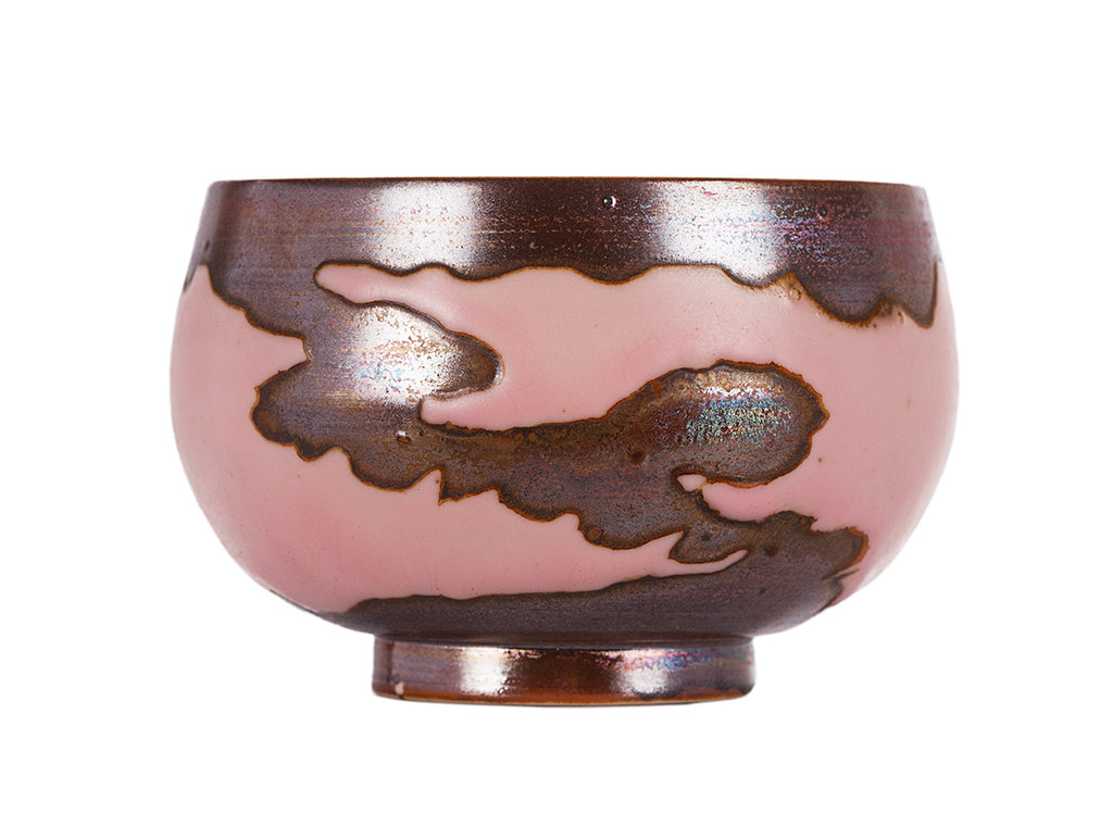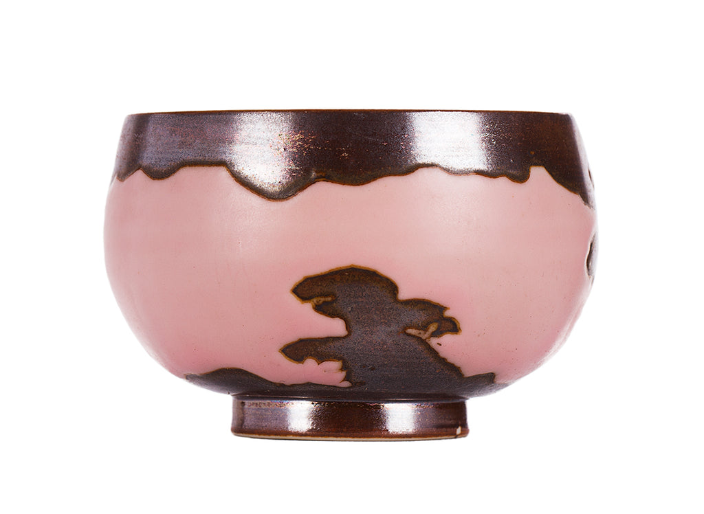 Small master cup with a bold pink glaze and flowing dark transmutation patterns. Compact shape ideal for solo Gongfu tea practice.